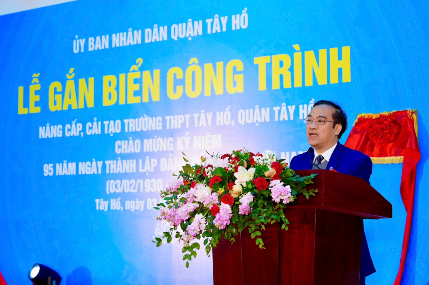 Ông Nguyễn Anh Tuấn - Hiệu trưởng Trường THPT Tây Hồ phát biểu tại buổi lễ.Phát biểu tại buổi lễ, ông Nguyễn Anh Tuấn - Hiệu trưởng Trường THPT Tây Hồ khẳng định: “Công trình Trường THPT Tây Hồ là minh chứng cho sự quan tâm đặc biệt của quận đối với sự nghiệp giáo dục, đồng thời là hoạt động có ý nghĩa sâu sắc nhằm chào mừng 95 năm ngày thành lập Đảng Cộng sản Việt Nam. Công trình không chỉ mang lại một môi trường học tập khang trang, hiện đại mà còn là động lực thúc đẩy chất lượng giáo dục của nhà trường.”