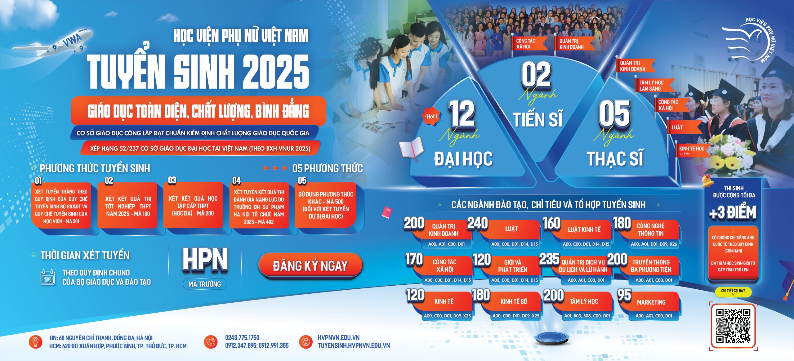 Đối với Học viện Phụ nữ Việt Nam, năm 2025 tiếp tục đánh dấu sự đổi mới trong công tác tuyển sinh đại học chính quy. Học viện dự kiến tuyển sinh 2.100 chỉ tiêu cho 12 ngành học với 5 phương thức xét tuyển linh hoạt, bao gồm: